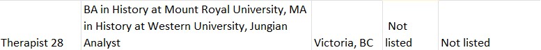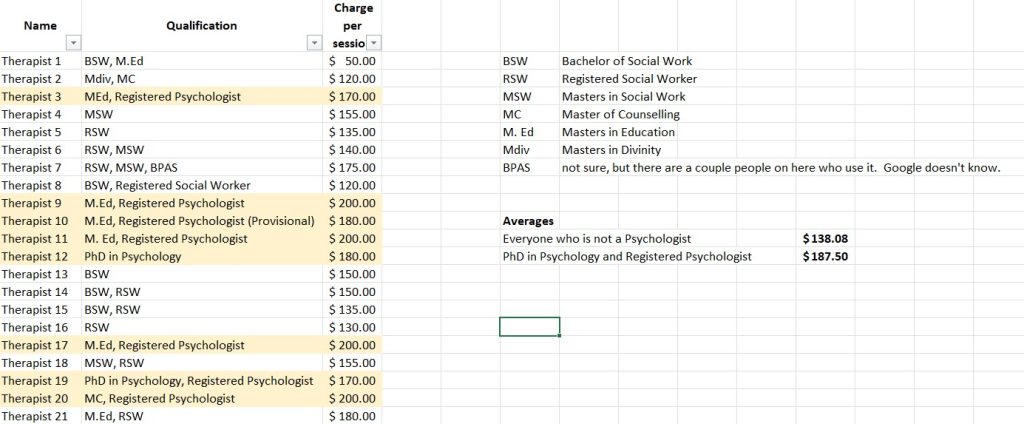 As you can see, there are only 5 therapists who posted their fees (thank-you!). The average between the five is $141.42 CAD which is only a raise of $3.34 CAD from being a provincially-licensed psychotherapist (Ontario) or Counsellor (Saskatchewan).