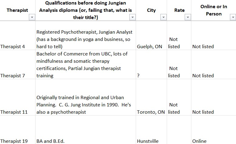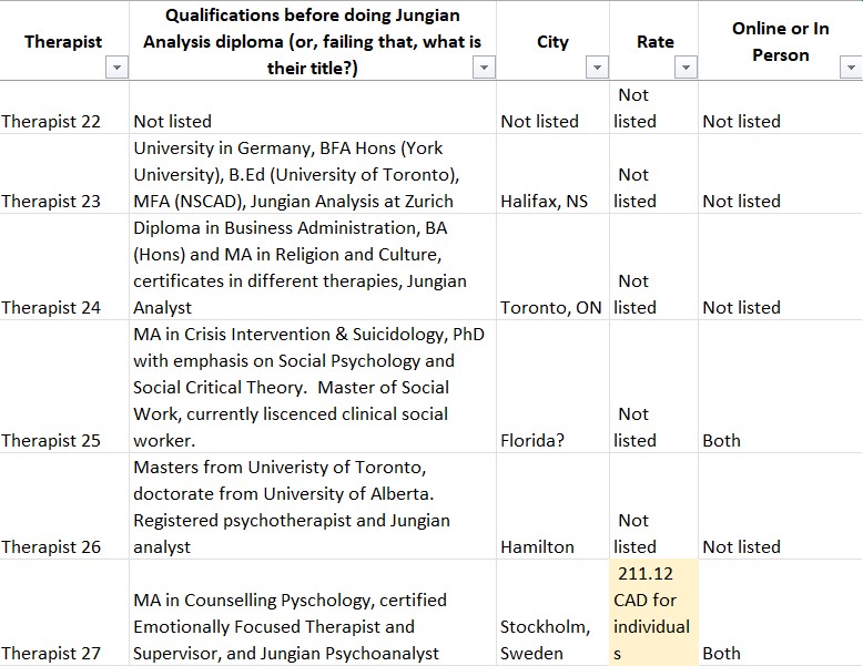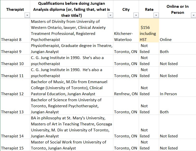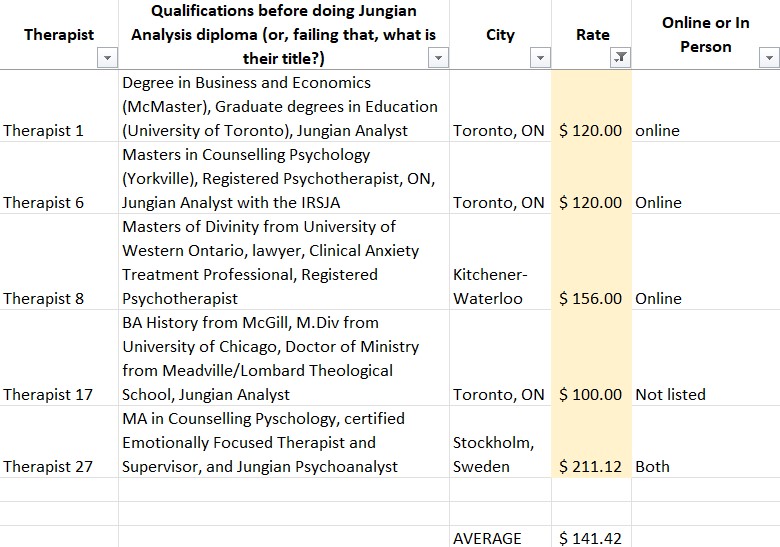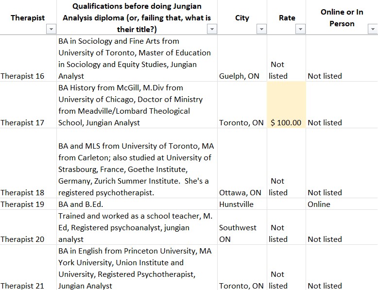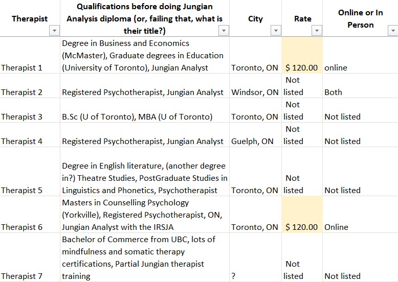 So I decided to look up the websites of Jungian Analysts listed on the OAJA website. Bear in mind, this is only the therapists who have websites, and I’ve highlighted in beige the very few who have posted their fees: