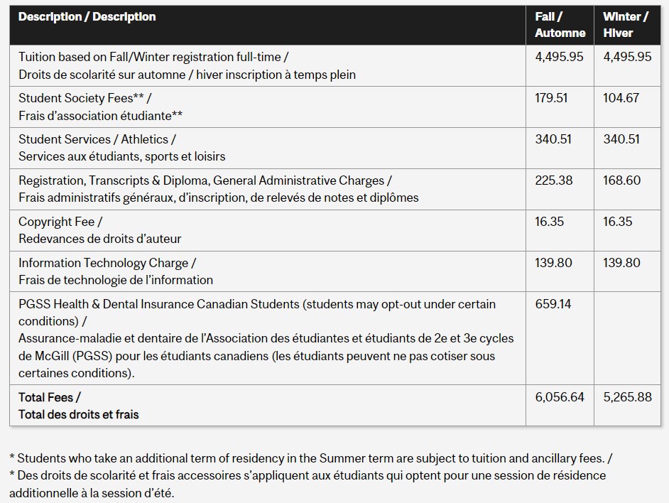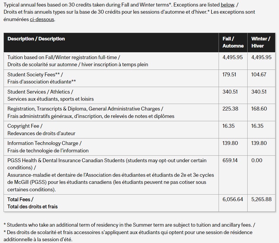 You have to pay higher fees if you’re from outside Quebec, so to keep things simple, I’m just quoting the fees for outsiders. If you’re a Québécois(e), your tuition will be lower.