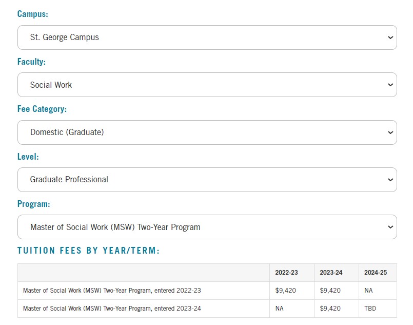 So to do this MSW, you need $18,840 (plus practicum fees?) to do a 2-year full-time Masters. This program, I believe, in on the St. George campus, which is downtown Toronto, and you’d need to find affordable student housing.