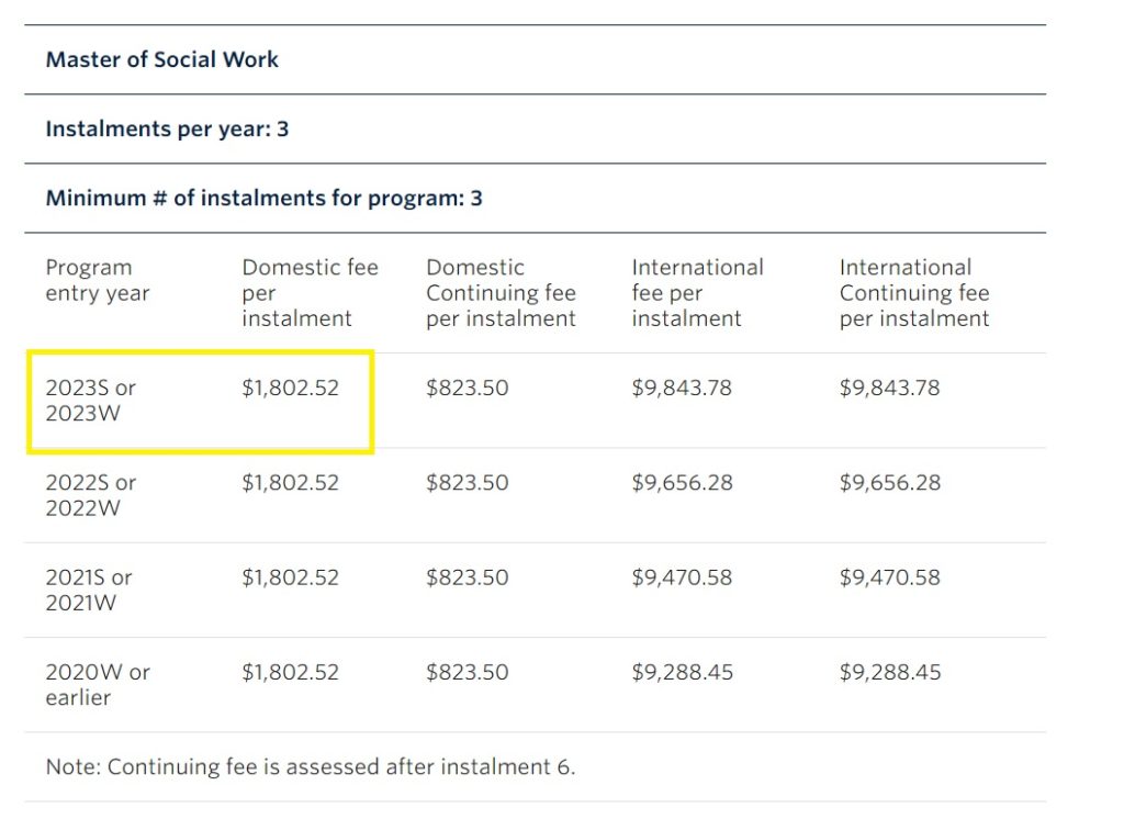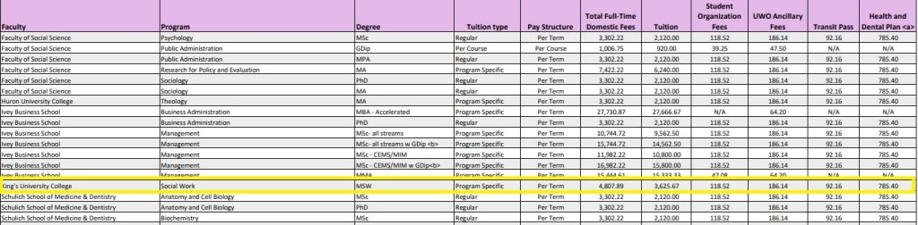 UWO doesn’t have their tuition posted yet for 2024 (makes sense, it’s a bit early), but here are their 2023/2024 full-time graduate rates. The picture below is a bit blurry, but it’s $4,807.89/semester, which if you’re taking the Foundational (6 term) Masters, you’ll be paying $28,847.34. I’m assuming this includes your practicum, but I’d verify that.