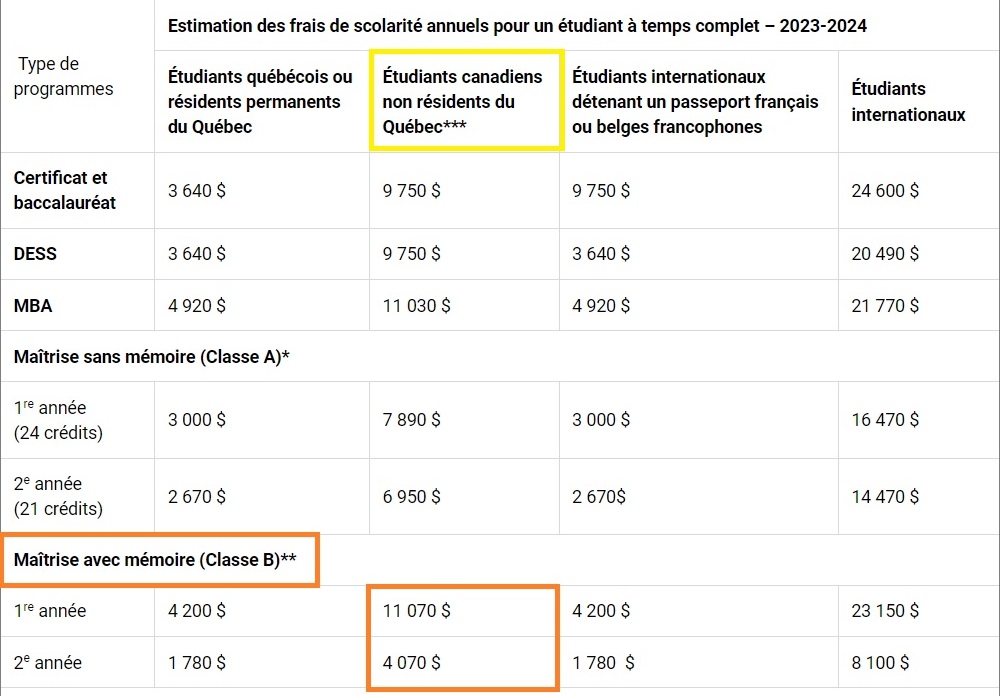 I’m really not understanding their tuition schedule because according to the Pdf provided on their site, it looks like BOTH their tracks (recherche and intervention) are Classe B fees, and yet the schedule differentiates between the two tracks: