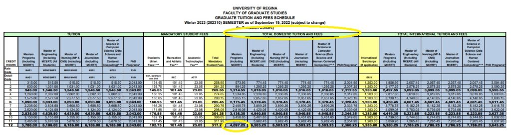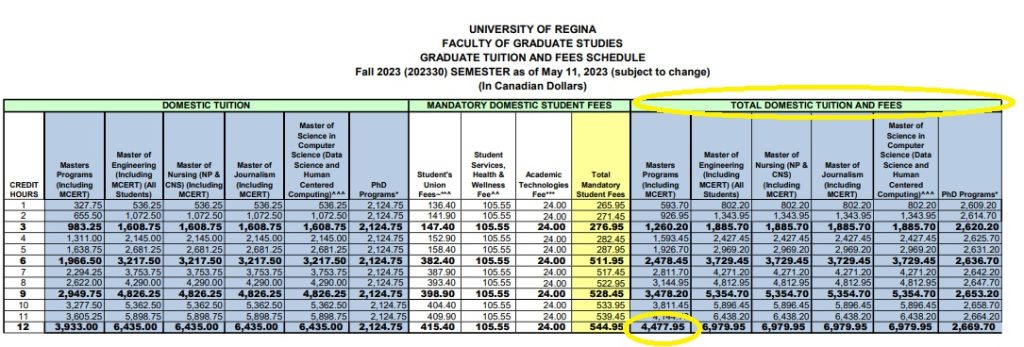 I’m not really understanding how this works- in these charts, the highest amount of credit hours is 12- that means students are only taking 4 classes (if their courses are 3 credit hours each). There is much more information here, but it doesn’t talk about credit hours, so I don’t know if this is accurate, but if we take $4,477.95 + $4,097.25, we get $8,575.20, which cannot be right because they’re saying that your thesis/practicum have to take up 450 hours which I’m not sure if you do during the year, or after the year. If you decide to attend the University of Regina, make sure you contact them to find out the actual cost because I might be missing something.