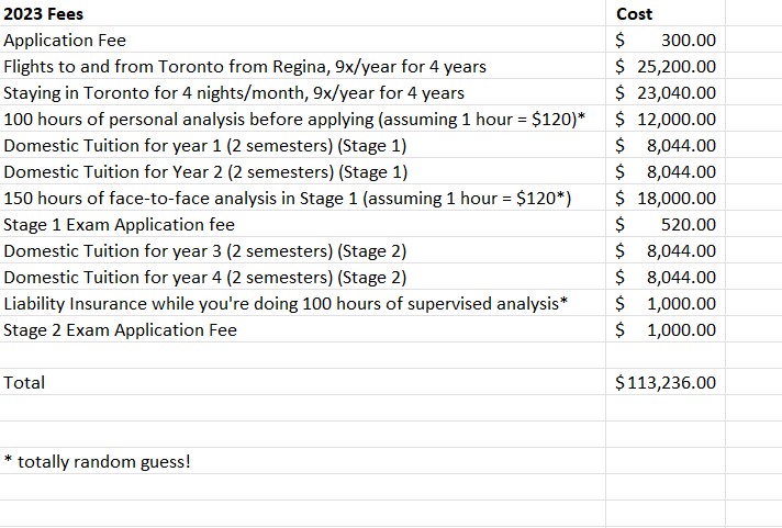- 2. If you don’t have a Masters that qualifies you for a provincial license to be a clinician, there is another way to become a Jungian Analyst, and the Ontario Association of Jungian Analysts is one of the (few?) associations that provides that other way. It involves having “a graduate degree or equivalent” (I’m not 100% clear what an equivalent might be, but I’ll expand later), but if you get in, it takes at least four years, and the 2023 OAJA tuition is $4,022 per semester, meaning tuition alone for your four years is CA $16,088. This doesn’t include travel to and from the school 9 times per year, the cost of 100 hours of personal Jungian analysis before applying, the cost of 300 hours of personal Jungian analysis while in the program, and the various fees you pay along the way for registration, exams, books, insurance to practice, and other sundries. For someone from the Prairie provinces, like me for example, who’d have to travel back and forth for four years for courses, let alone for analysis appointments, we’re looking at more like CA $113,236 (not including books or other fees that may not be listed on the website). (You’ll see my excel spreadsheet with the breakdown below.)