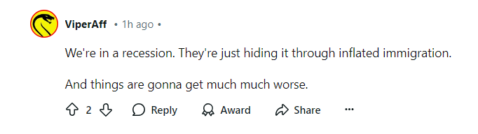 I’m not an economist, but I had an aha moment while reading through the Reddit comments from a 19-year old Saskatchewan student’s post. Unbelievably, they’ve been applying for jobs for three years and haven’t been able to find one. Probably 95% of the comments under their post blamed mass immigration, which I guess you can see better near Toronto and the bigger cities (of if you’re a student), but one comment in particular caught my eye.