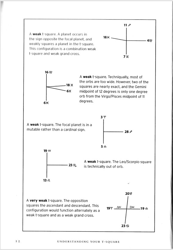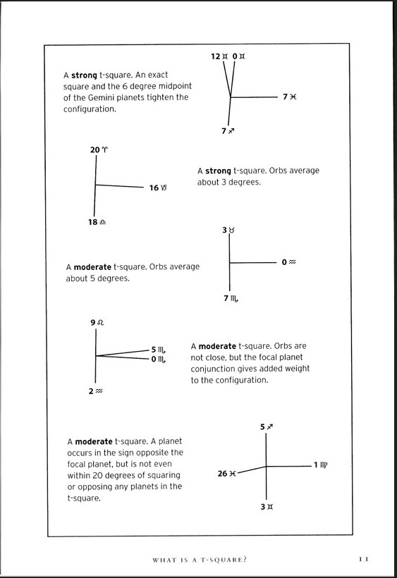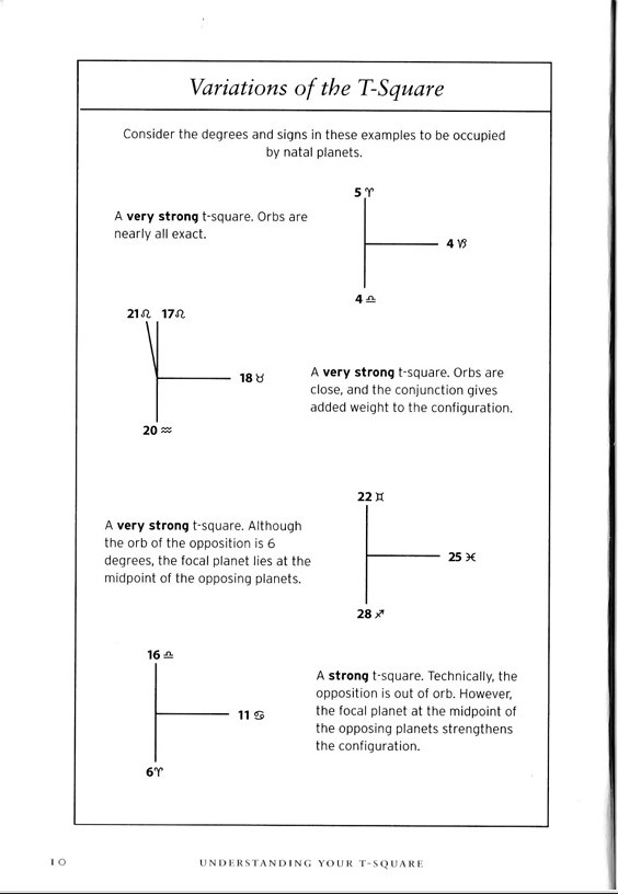 So the planets don’t have to be EXACTLY 90 or 180 degrees apart; that would be a very tight – and therefore very frustrating- T-square. Different astrologers give different “orbs” (degree allowances)- like some will say they have to be within 5 or 7 degrees of each other to be considered in aspect. I consider about 10 degrees for my orbs. Here is Tracy Marks in her book defining very strong to very weak T-squares: