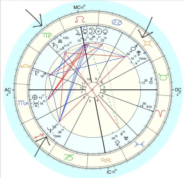 – Neptune at 18 degrees (bottom left of the circle)